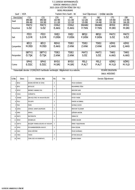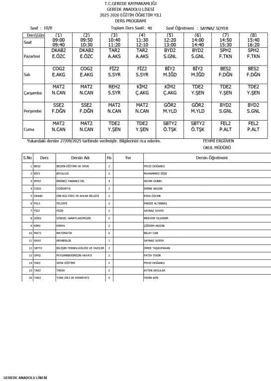 Ders programı 29 Eylül 2025 Pazartesi itibariyle...