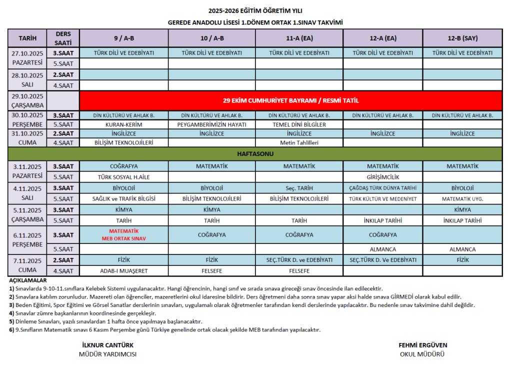1) Sınavlarda 9-10-11.sınıflara Kelebek Sistemi uygulanacaktır. Hangi öğrencinin, hangi sınıf ve sırada sınava gireceği sınav öncesinde ilan edilecektir.